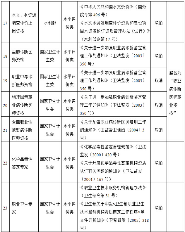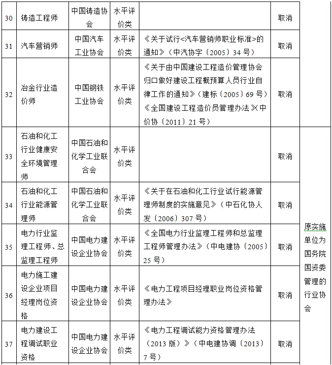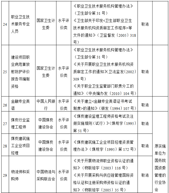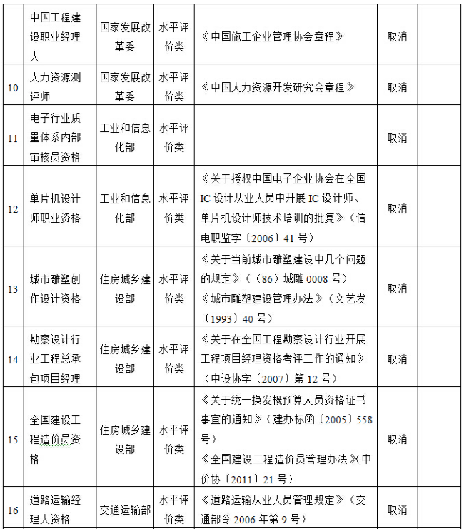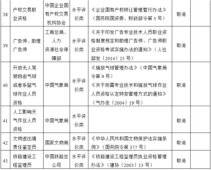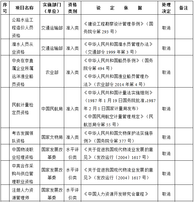 国务院决定取消的职业资格许可和认定事项目录