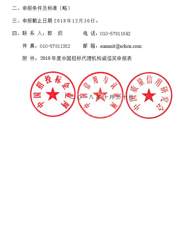 关于申报2018年度中国招标代理机构诚信奖的通知