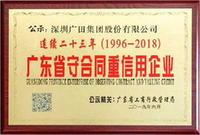 近日,广田集团凭借良好的社会信誉和健全的合同管理体系,连续二十三年荣膺“广东省守合同重信用企业”称号。