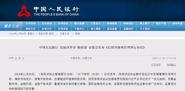 11月29日, 央行、财政部、发改委和证监会四大部委联合发布《信用评级业管理暂行办法》(下称《办法》)。这是我国评级业迎来的首个由多个部委联合发布的高级别监管法规,可谓信用评级业统一监管的里程碑式文件。