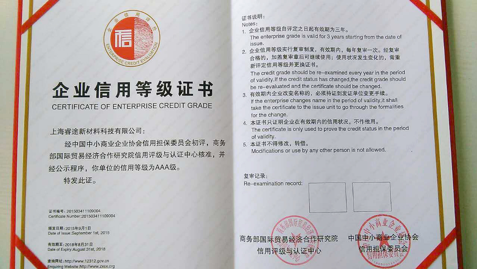 上海睿途新材料科技有限公司荣获企业信用评价AAA级信用企业