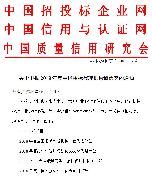 关于申报2018年度中国招标代理机构诚信奖的通知
