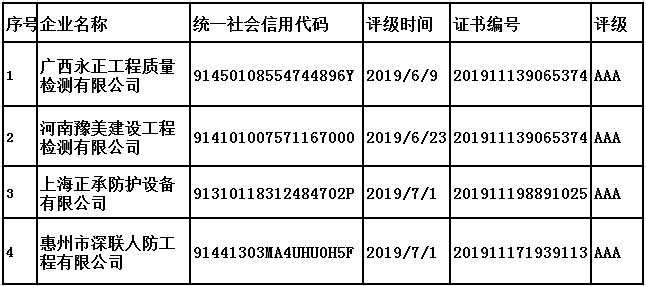 根据《国务院关于印发社会信用体系建设规划纲要(2014—2020年)的通知》(国发〔2014〕21号)的文件精神,中国国际经济技术合作促进会与商务部中国国际电子商务中心下属企业北京国富泰信用管理有限公司联合开展了2019年信用等级的申报评价工作。本着自愿、诚信、公正、科学、严格的原则,经企业自愿申报、协会初审、中促会信用工作委员会和北京国富泰信用管理有限公司专家评审组终审,确定了4家企业信用等级。 现将评价结果予以公示,征求社会各方面的意见。