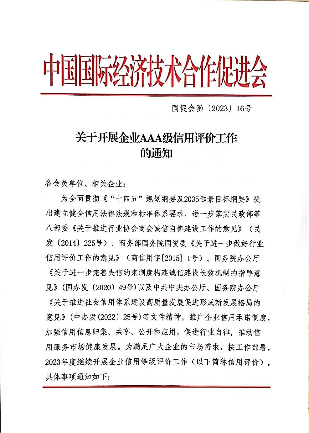 关于开展企业AAA级信用评价工作的通知