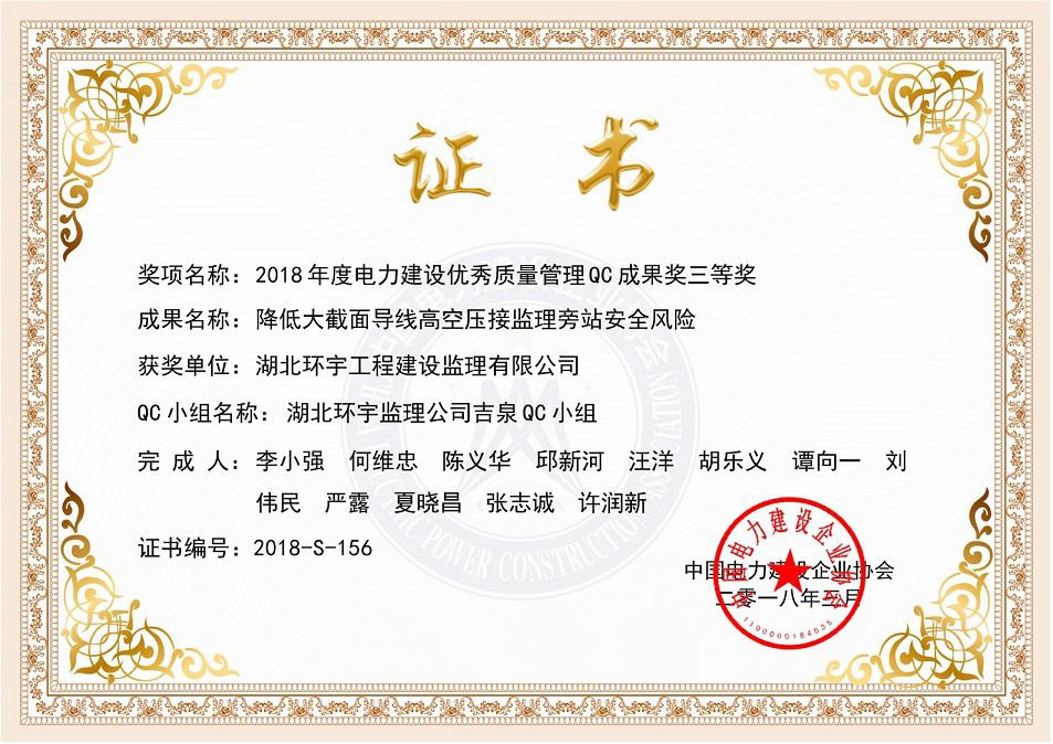 (通讯员:张志诚)3月26日,2018年中电建协QC成果比赛最终结果揭晓,湖北环宇监理公司发布的4项QC成果3项获奖。其中“降低1250mm²大截面导线高空压接监理旁站安全风险”、“实行区域主体责任化加强现场
